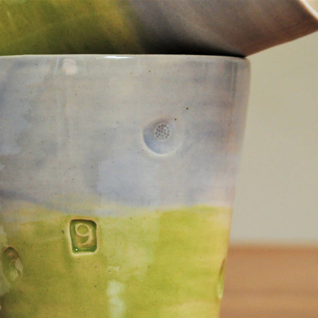 - Glazed with lime green and lavender blue glaze with number 9 stamped into the clay.