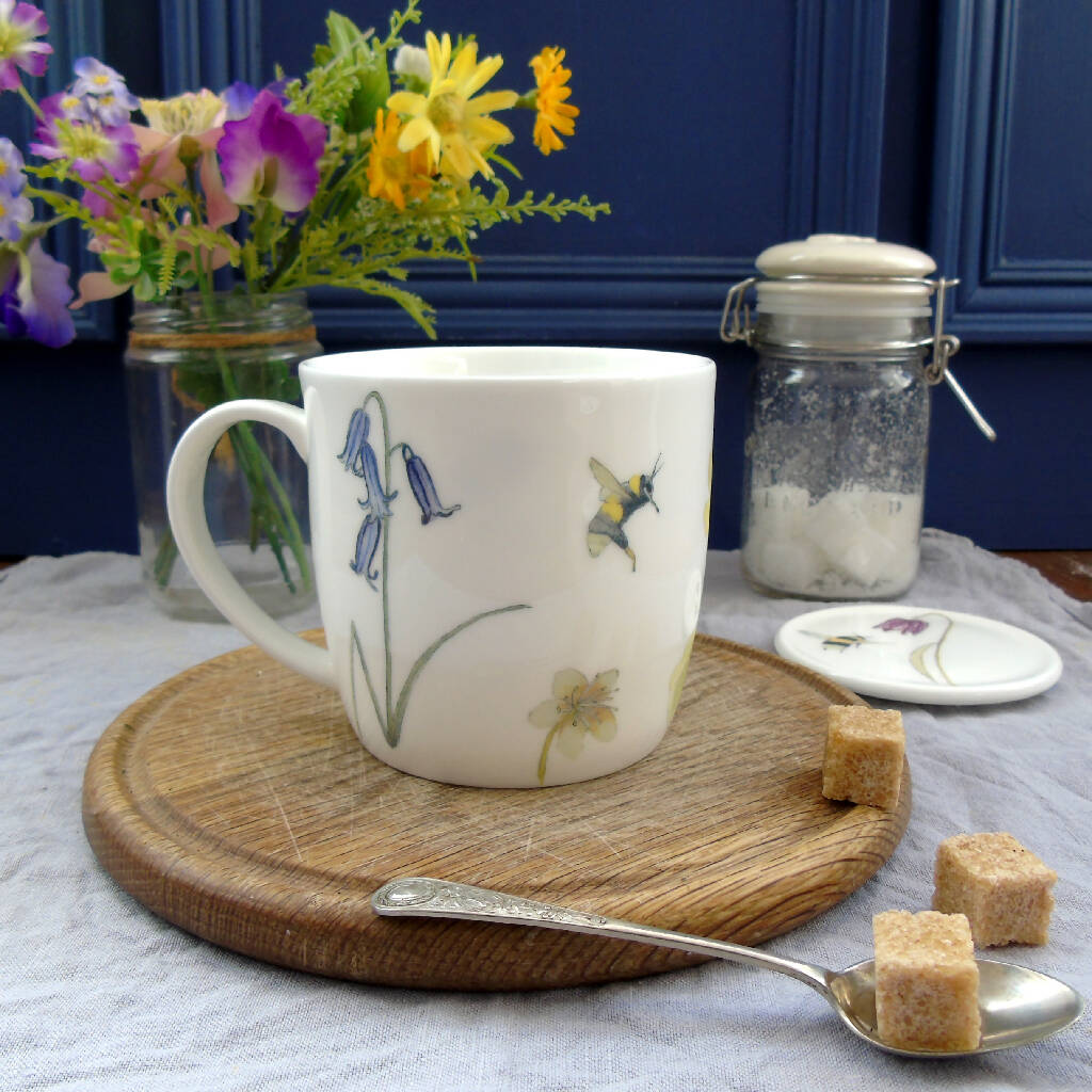 A pretty yet practical mug. My watercolour paintings of busy bees pollinating bluebells, primroses, fritillaries and forget-me-nots have been professionally printed onto ceramic transfers, which are cut and applied by hand to create the finished design.