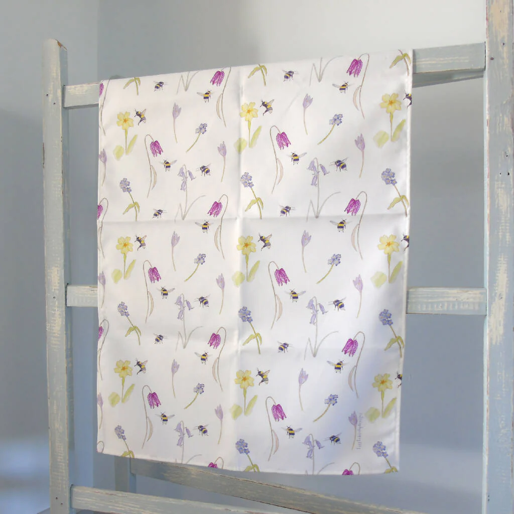 My colourful watercolour paintings of bees and spring flowers made into a repeat pattern and digitally printed in the UK onto a premium cotton tea towel. Inspired by the flowers in my garden. A lovely Mother's Day or Easter gift.