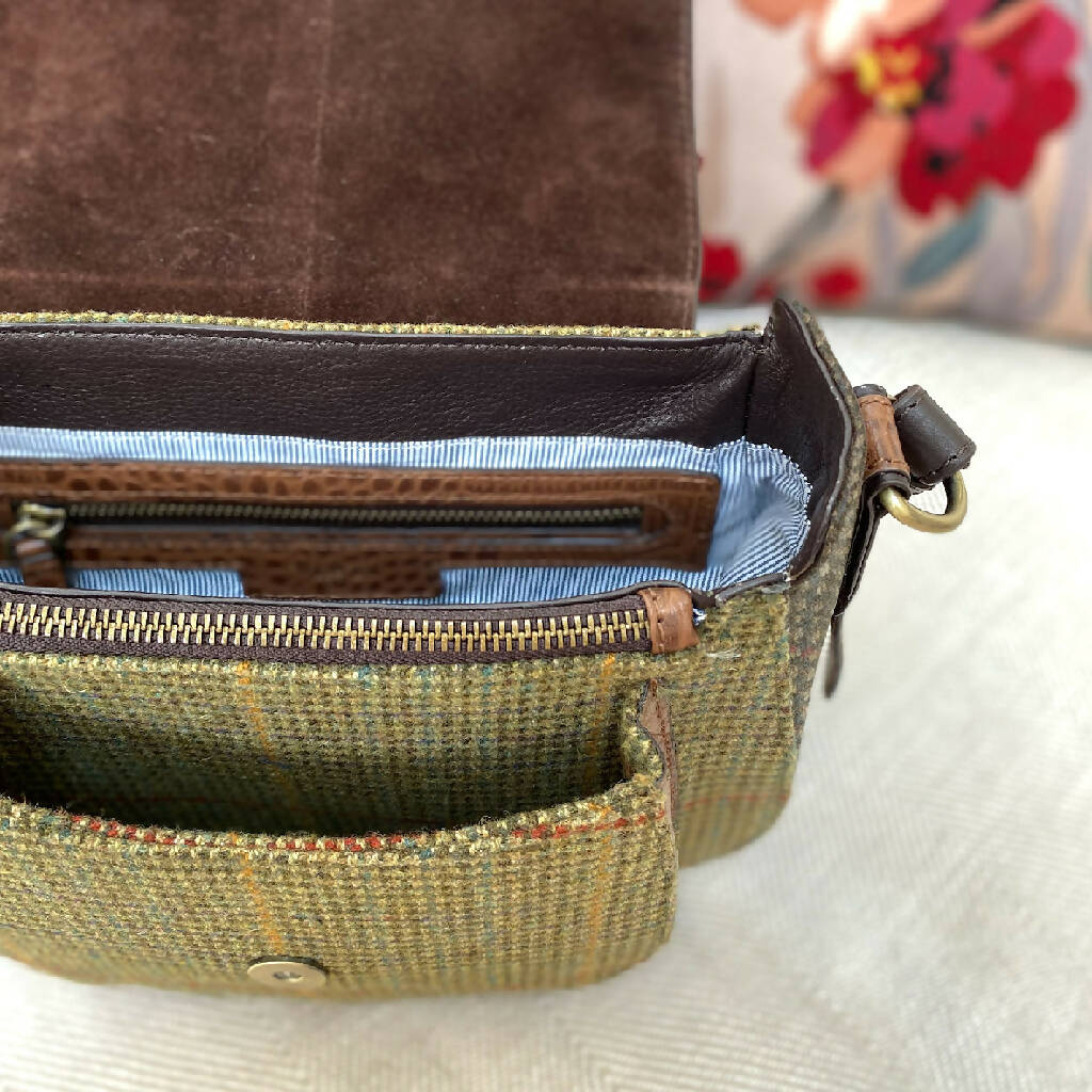 Enjoy timeless style with the Belton Tweed Saddle Bag. Meticulously crafted from woollen tweed and embossed leather, it boasts secure magnetic flap closure, multiple zipped and slip-in pockets, and an adjustable, detachable strap. Perfect for all occasions. Lined with suede and cotton, it arrives with its protective dust bag.