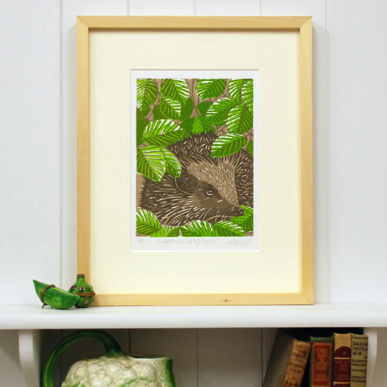 Beneath the Autumn Beech, featuring a Hedgehog taking cover under the shade of the copper leaves of a Beech hedge, hand-printed in 4 hand-blended inks. Signed, numbered and titled in pencil by the artist.