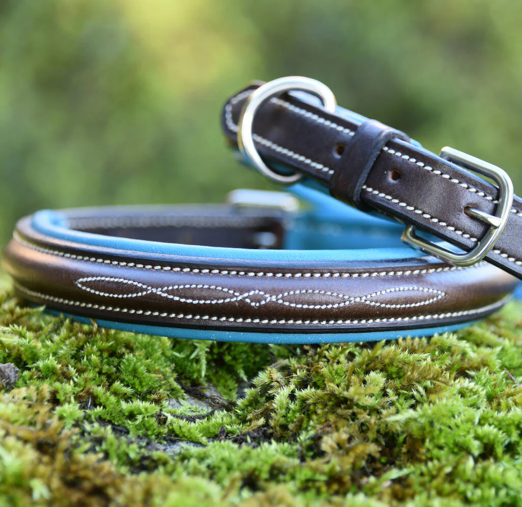 The Bleaberry collar is hand made in beautiful bridle leather, with our signature contrast stitch detail, with a contrasting colour padded leather lining. The collar is 20mm wide with a soft leather padded interior. The finest quality metal hardware has been used for the fittings. Available in 3 sizes Small, Medium and Large