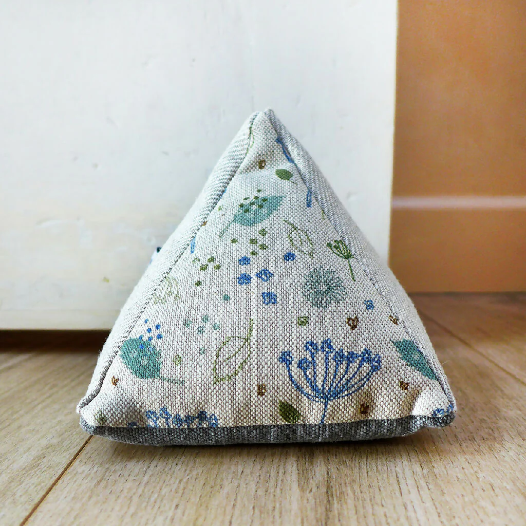 A floral Blue Parsley linen doorstop made from Charlotte's classic cow parsley and wildflowers print fabric and natural linen.