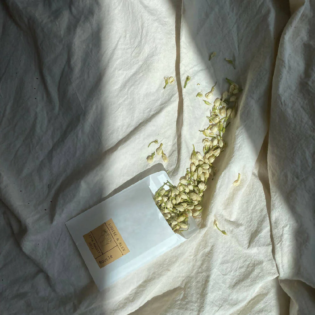 Enhance your wedding day with the enchanting touch of these exclusive Bouclé blends of dried botanicals, serving as the perfect natural and biodegradable confetti. Capture the dreamiest confetti shots and add a floral finishing touch to your special day.
