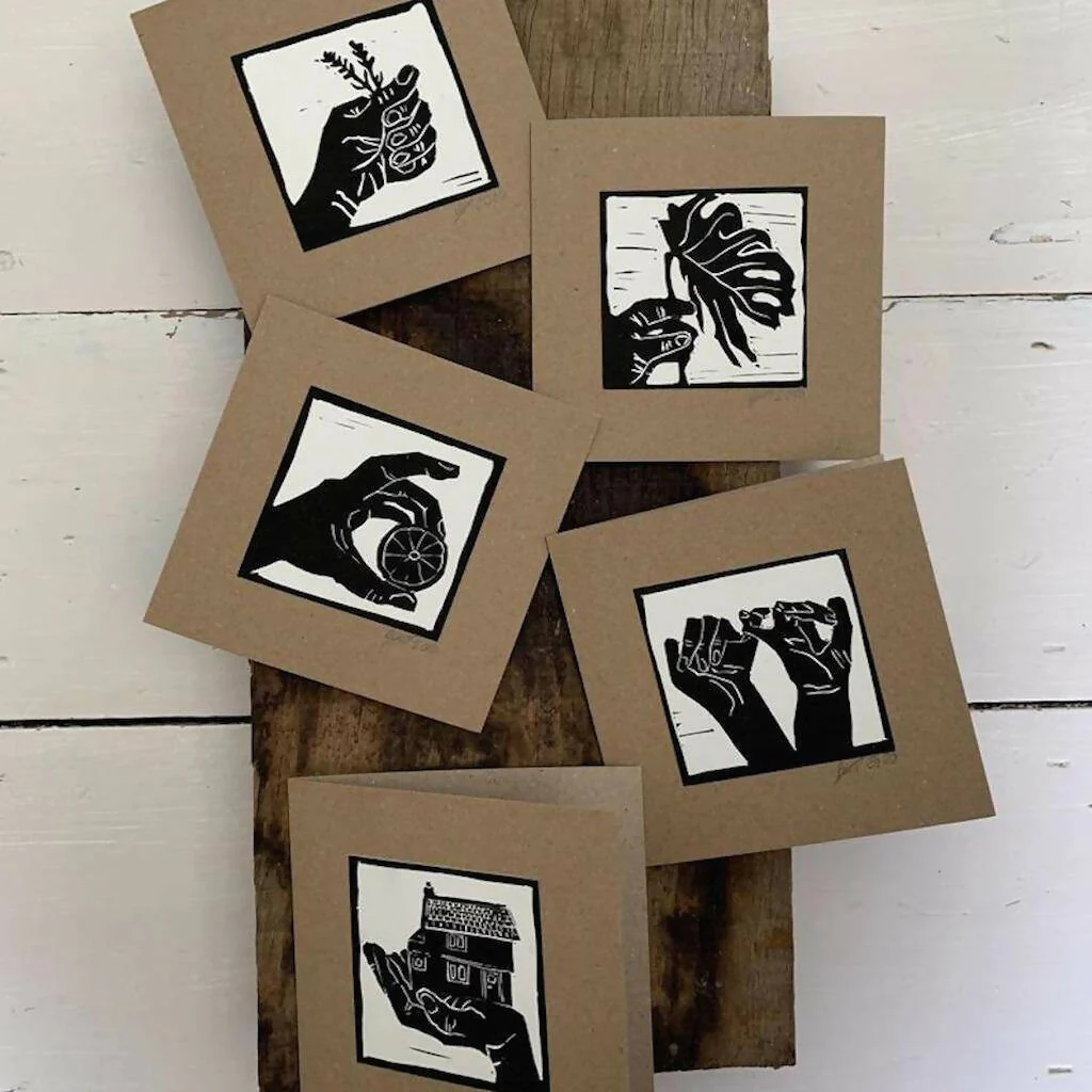 Bouclé 'Hands Full' Hand-Printed Linocut Greetings Card Set of 5 Cards