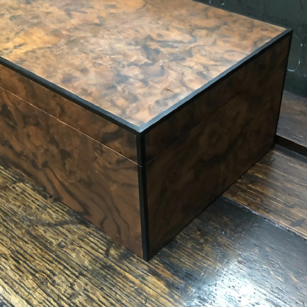 This luxury box is meticulously handcrafted from book-matched burr walnut and accented with black ebony inlays for a sophisticated and timeless design. Offering ample storage space, it is lined with your choice of leather or fabric, allowing for a fully customised finish that complements your personal style. Ideal for storing valuables or as a statement piece in your home, this luxury wooden box blends form and function, offering both beauty and practicality for years to come.