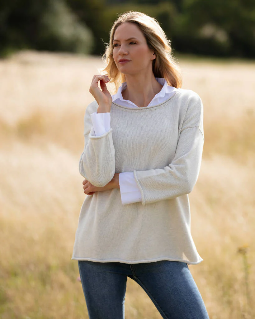 The Clarissa is an oversized jumper knitted from GOTS-certified pure organic cotton, combining laid-back comfort with thoughtful detailing. Made in small runs, it features a relaxed silhouette with a shallow scooped neck, drop shoulders, and three-quarter sleeves. Rolled hems and subtle side slits add softness and ease of movement.