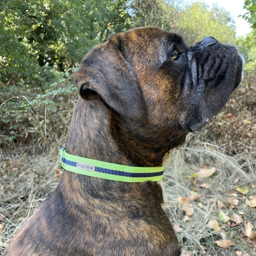 In a vibrant lime and navy blue stripe the fully adjustable collars are made from a soft but robust polypropylene webbing with black plastic clips, D ring and Reg&Bob label