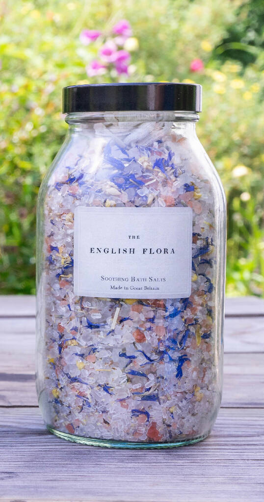 English Flora Soothing Botanical Bath Salts. Blended natural Himalayan and Sea Salt with added Epsom Salts, beautifully fragranced with essential oils of Eucalyptus, Lemongrass and Cyrpress. Complete with Chamomile, cornflower and Lavender petals. Supplied with a cotton bag in which to decant the salts before dropping in the bath. After use dry and reuse bag.