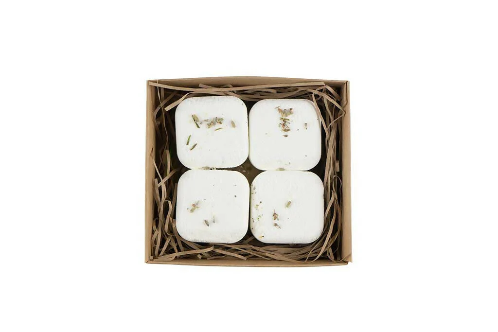 English Flora Relaxing Shower Steamer. With essential oils of Spearmint, Lemon Peel and Eucalyptus with Lavender in kosher salt. Place in the base of the bath/shower to create beautifully fragranced shower experience. 4 steamers per box.