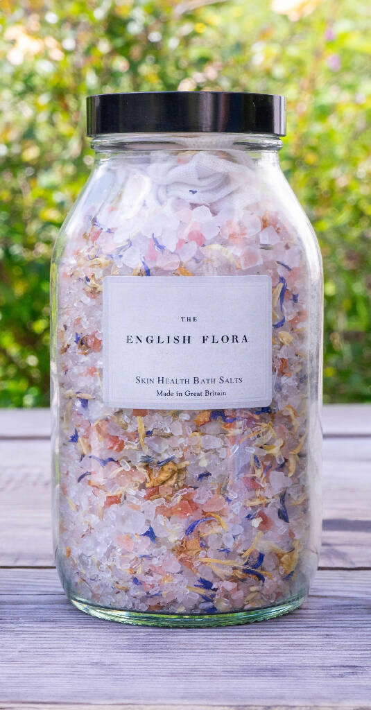 English Flora Skin Health Botanical Bath Salts. Blended natural Himalayan and Sea Salt with added Epsom Salts, beautifully fragranced with essential oils of Lavender, Geranium and Chamomile. Complete with cornflower, Jasmine, Lavender and rose petals. Supplied with a cotton bag in which to decant the salts before dropping in the bath. After using dry and reuse bag.