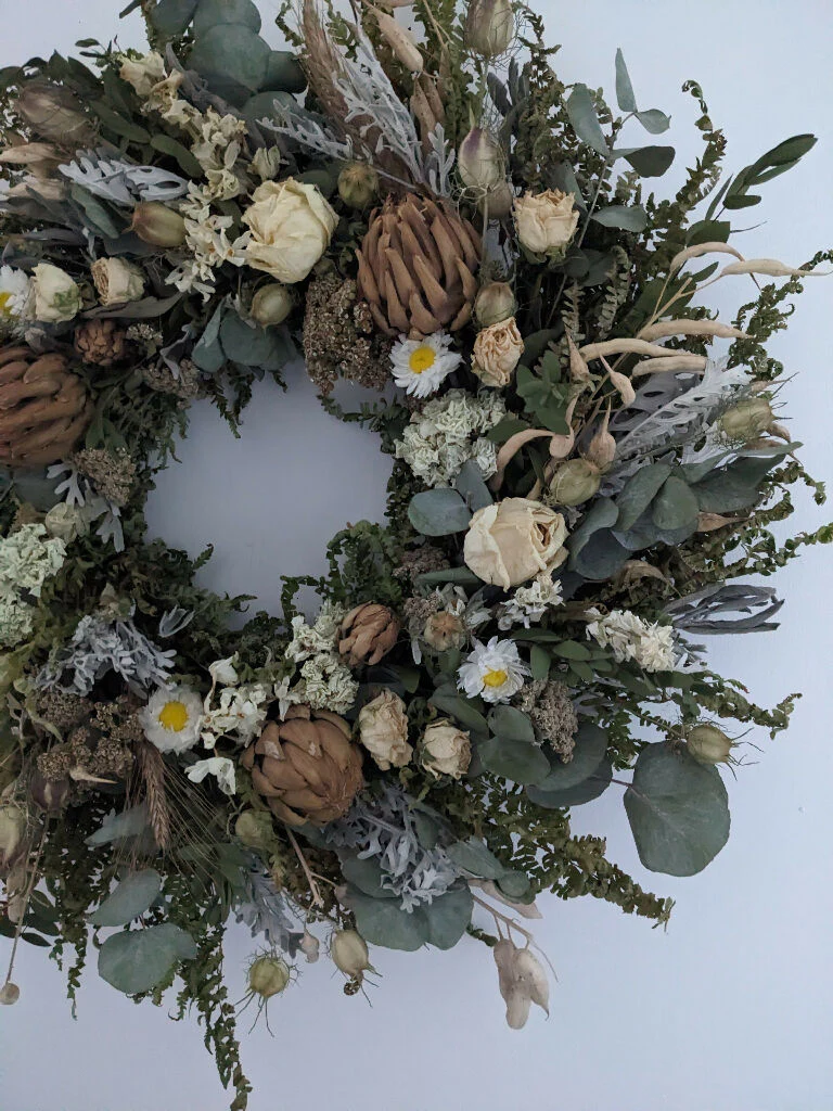 Timeless and serene, this handcrafted forever wreath features a natural palette of soft whites and muted colours