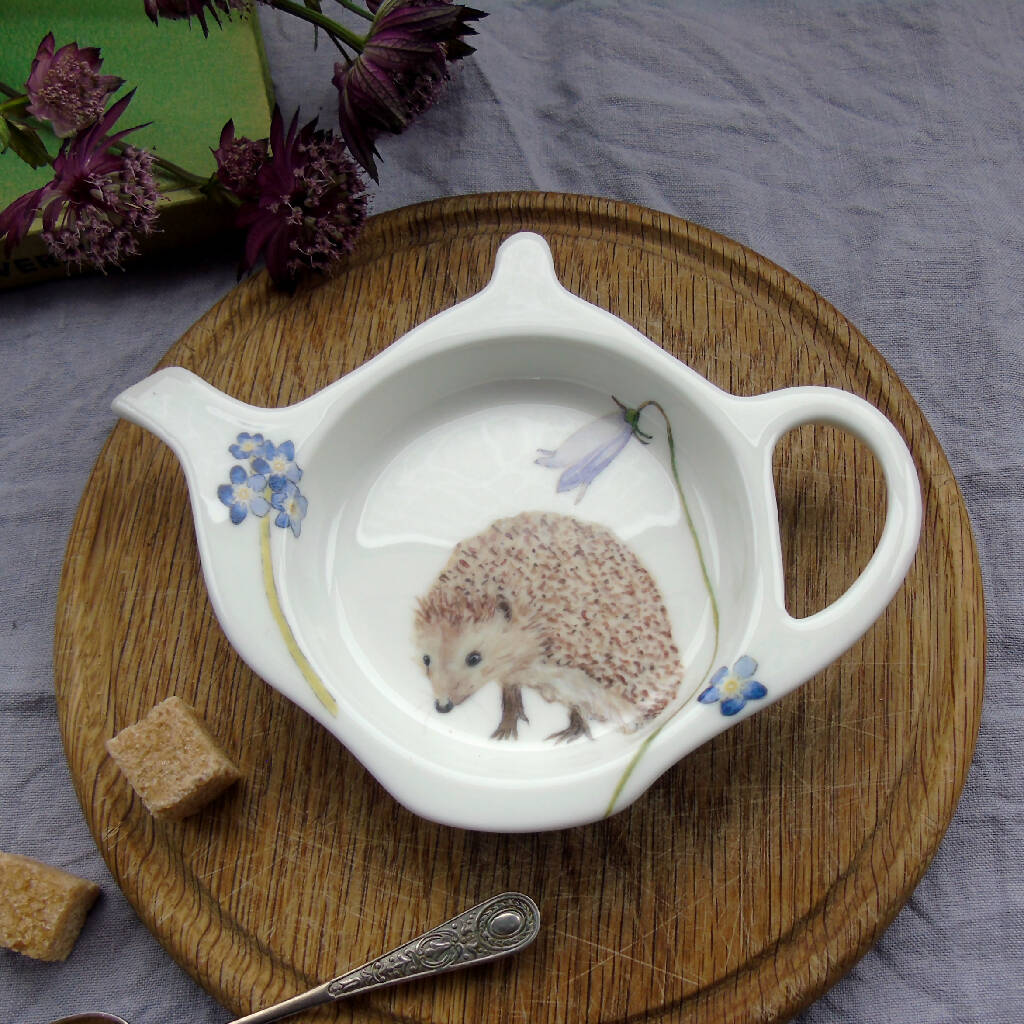 This bone china teabag tidy features my watercolour paintings of a hedgehog, forget-me-not and a harebell. The teapot-shaped teabag dish is slightly larger than most, a perfect gift for tea-loving friends.