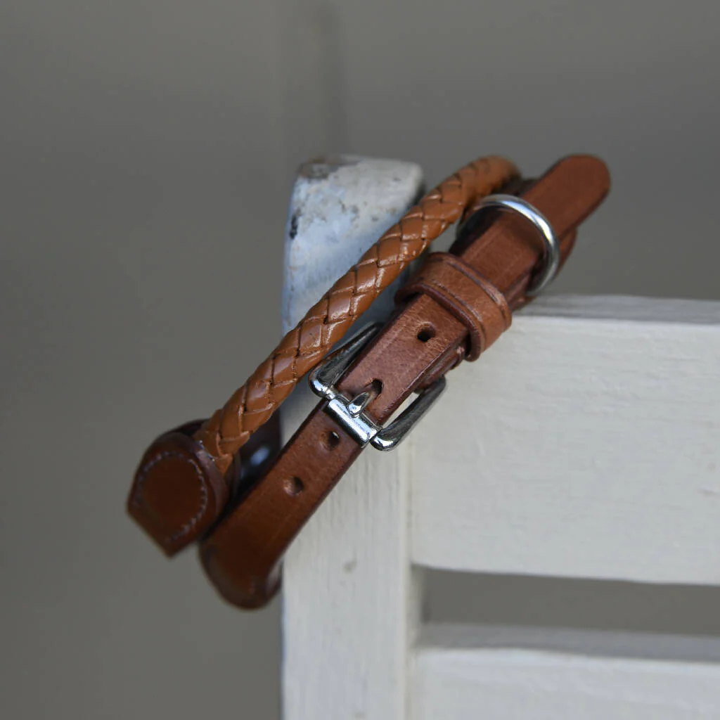 Lagain is our narrow, hand plaited leather collar for smaller dogs. Available in 3 colours: Dark Brown, Red and Tan leather, with solid chrome plated metal fittings, Lagan is available in 2 sizes, Small and X Small