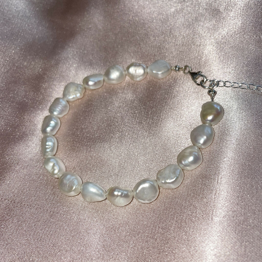This Freshwater Pearl Bracelet Comprises seventeen 10 MM Baroque pearls strung onto plastic-coated stainless steel. The clasp and findings are made from sterling silver.