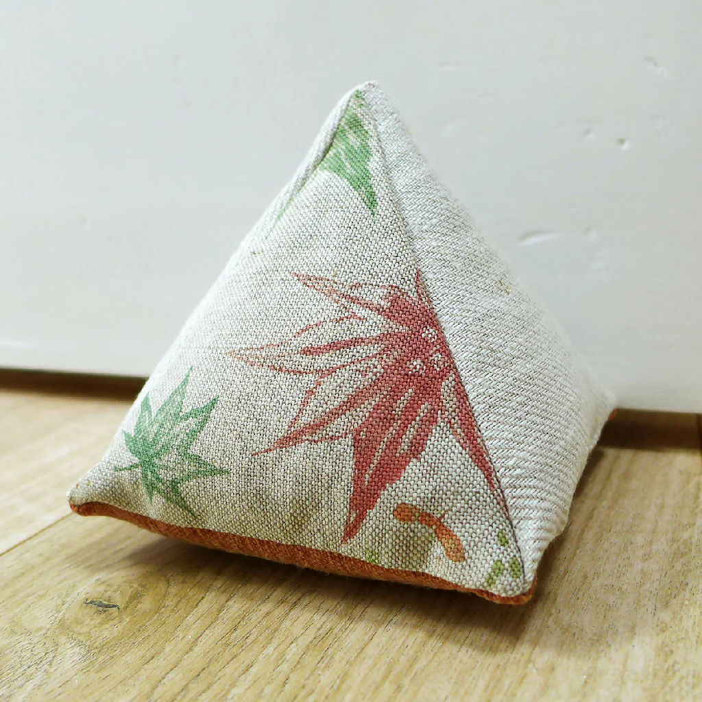 A Leaf Flurry linen doorstop made from Charlotte's maple leaf print fabric and natural linen.