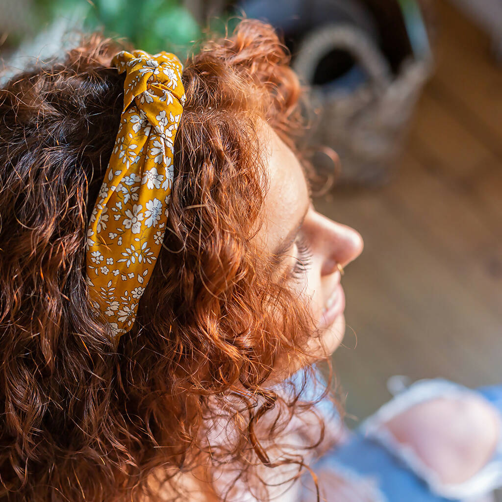 This classic style Liberty print headband has a low, subtle knot and a relaxed fabric style, making it perfect for everyday wear. Handmade in silky soft Liberty London, this Capel mustard print will add the finishing touch to any outfit.