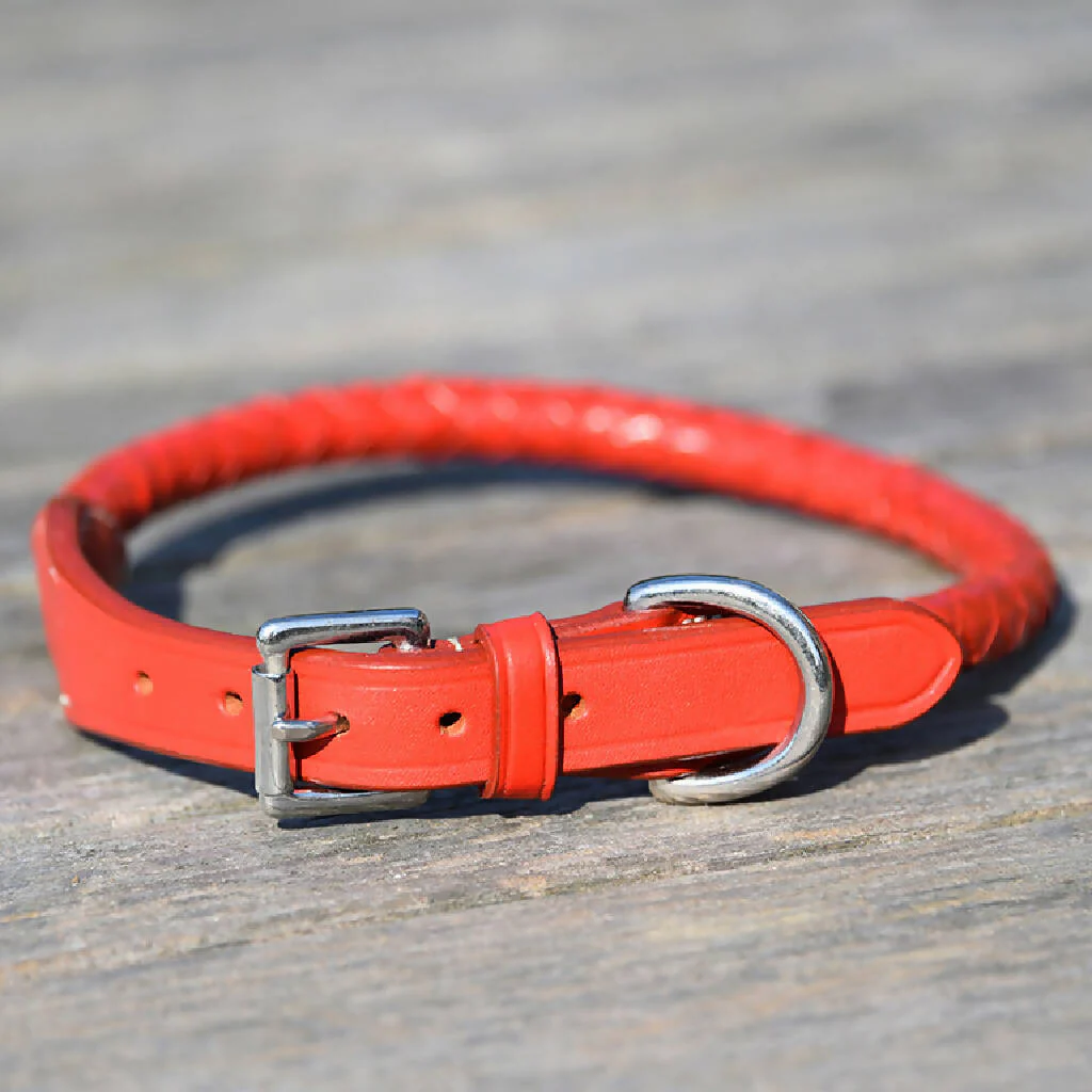 A beautiful rolled plaited leather collar in 3 classic colours, Red, Dark Brown and Tan and 3 available in sizes Small, Medium and Large.