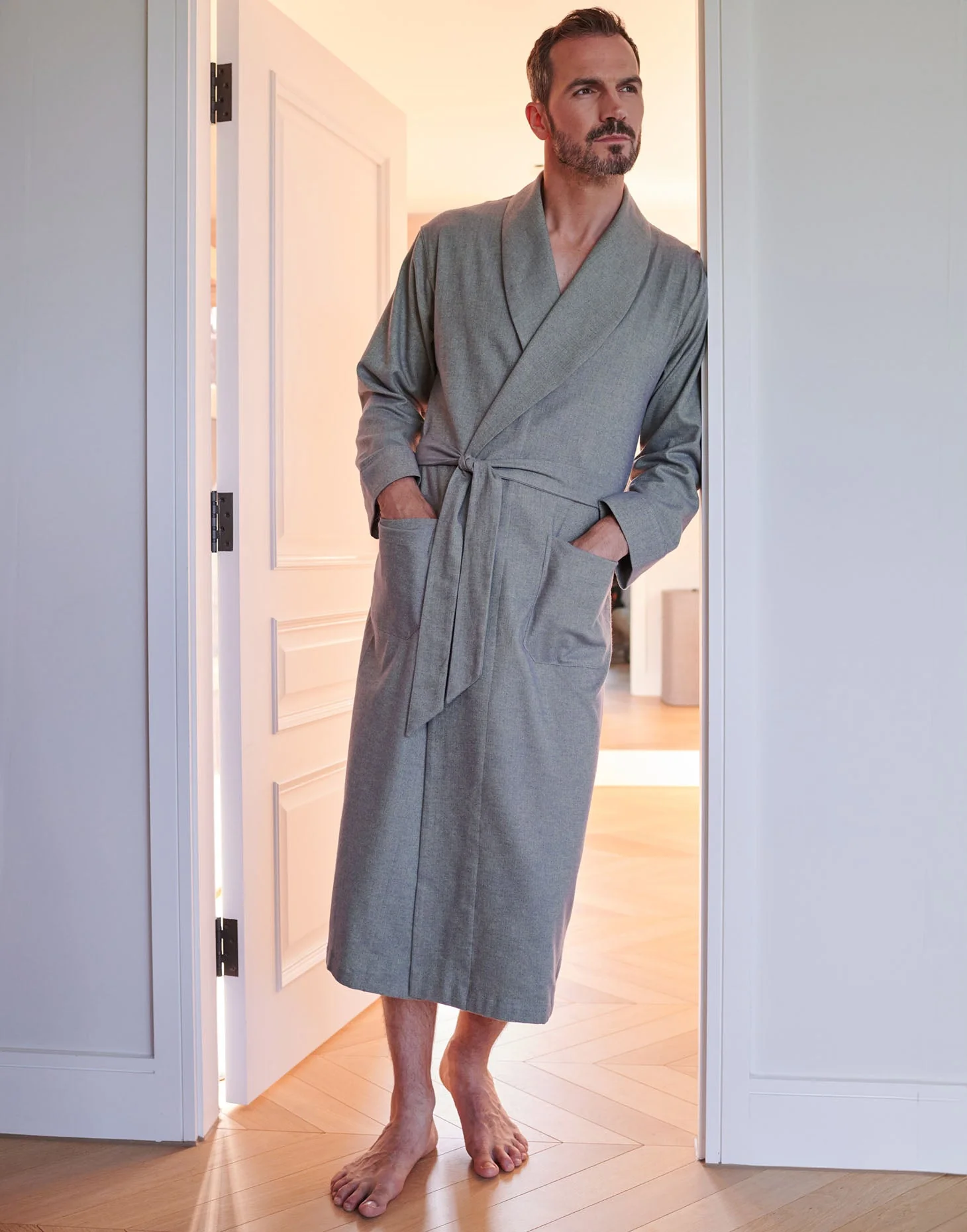 From leisurely mornings to cosy nights in, this exquisite dressing gown has you covered. It's crafted from the softest brushed cotton, which is woven to our exact specifications and the fibres brushed repeatedly for an utterly luxurious feel against the skin. This fabulously soft brushed cotton incorporates a wonderful ash grey and tarragon green woven into a subtle herringbone design. Giving a nod to the earthy tones of the heathland of Orkney and also to traditional weaving often found in the far reaches of Scotland. Made to our elegant design, the robe also features two pockets at the front, inside ties, a shawl collar and a belt tie. A must-own for the discerning gent.