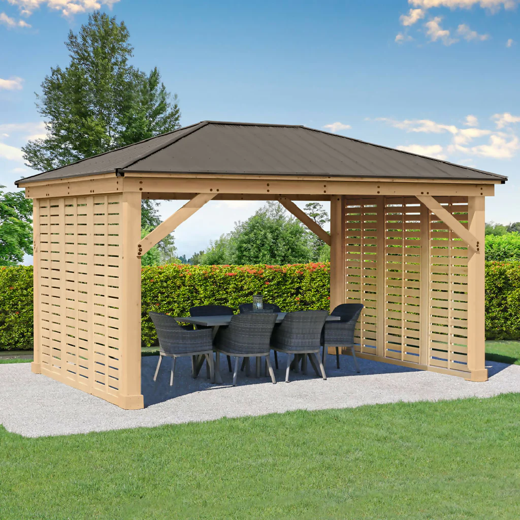 Expand your outdoor living space with the Meridian Gazebo with double privacy wall add on by Yardistry Direct. The privacy walls can be positioned on any side of the gazebo, providing further seclusion between neighbours, or simply protection from the breeze.