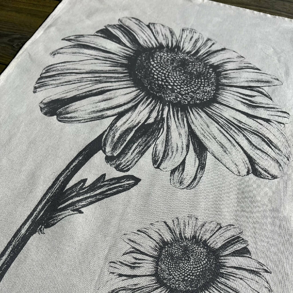 Designed and made in the UK, this tea towel is 100% natural cotton, and features an image of a daisy, taken from one of my pencil drawings.