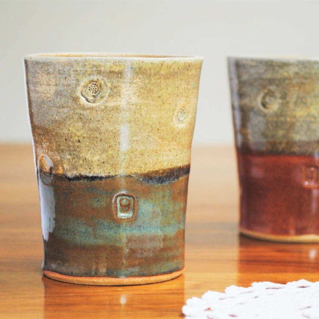 Thrown on the pottery wheel and made from stoneware clay, the mug-tumblers keep your drink warm for a longer time than an ordinary cup. On the other hand, they keep the white wine nicely cold.