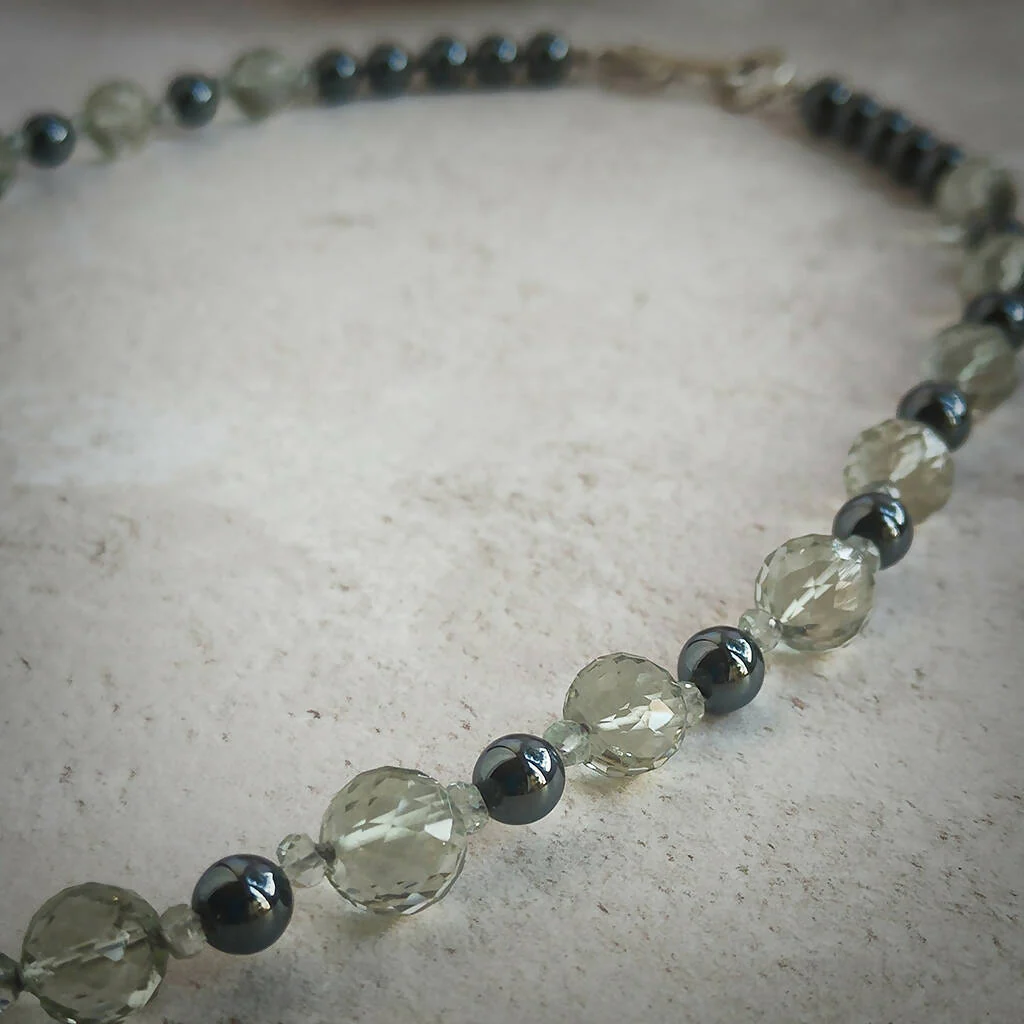 This is such a classic yet unusual Gemstone necklace made by Sarah. Beautiful Prasiolite (Green Amethyst) & Hematite Necklace strung on Grey Silk which is knotted between each gemstone. With a One of a Kind Hand Forged Sterling Silver Clasp. Designed to be worn on those special occasions and yet versatile enough to compliment everyday wear.