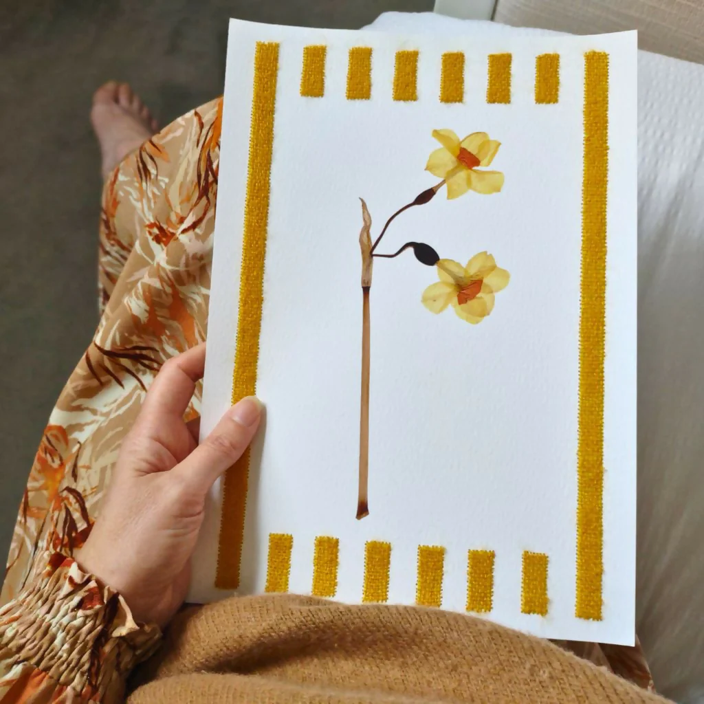 Do you love daffodils, and embroidery? If so, you’ll love this hand embroidered giclee print of pressed daffodils.