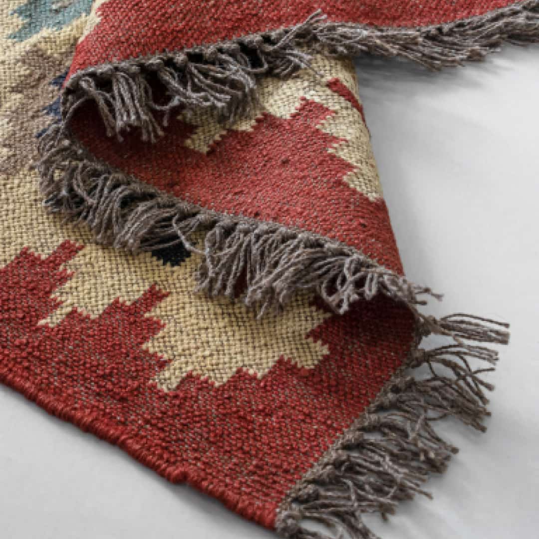 Our Kilim rug is brightly coloured, with an Indian-inspired design. With a geometric multi-coloured square design framed by a zig-zag line and red edge.