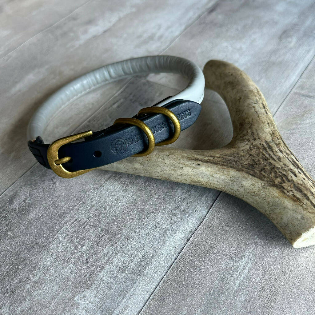 Super soft rolled leather with brass fittings make these elegant collars really attractive. This style is classic grey leather teamed with the contrasting pink or navy section around the buckle and D rings. The small and the smaller sizes have smaller and lighter buckles and a slimmer rolled section, to suit daintier dogs.