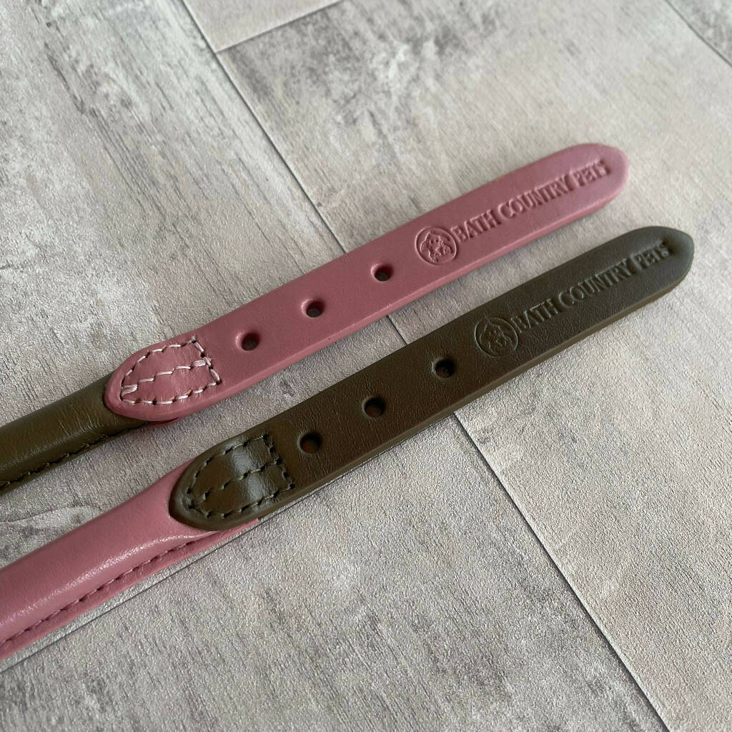 Super soft rolled leather with brass fittings make these elegant collars really attractive. This style is classic rolled design in Clover pink or Grouse green around the buckle and D rings. The small and the smaller sizes have smaller and lighter buckles and a slimmer rolled section, to suit daintier dogs.