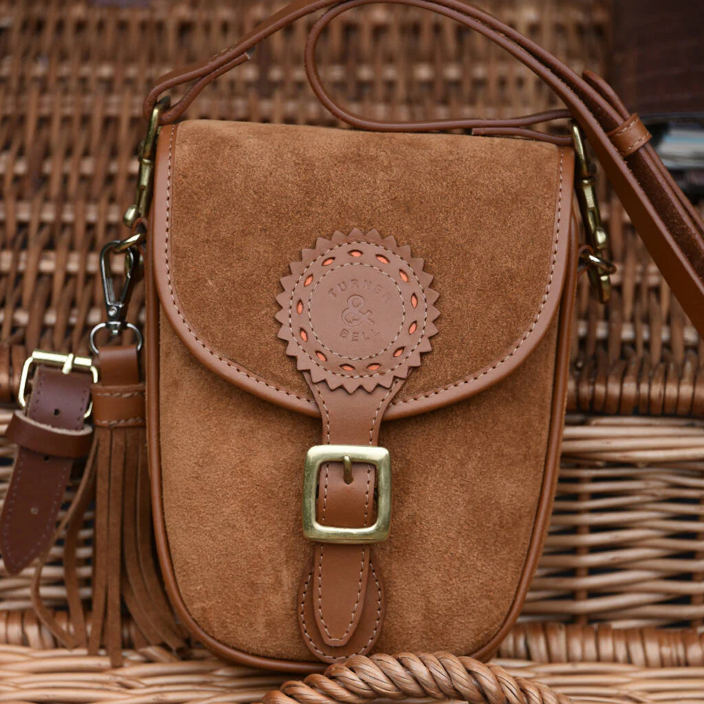Our mini crossbody bag, Rutland is perfect to hold essentials for a day out and about, in the city or the country, when you’re travelling light. In two colours Tan suede and Khaki suede, with leather piping, adjustable leather shoulder strap and leather lined.