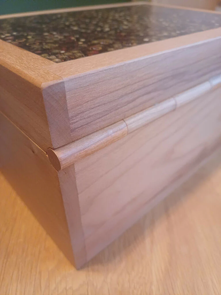 Hinges is solid cherry wood, as not to contaminate the contents or rust in the kitchen.