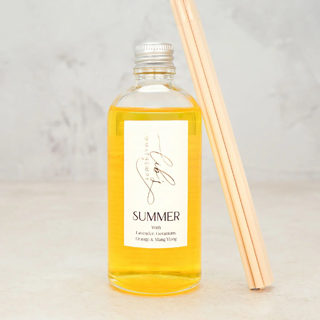 Bright, fruity and sweet, the Summer Essential Oil Reed Diffuser blends orange, lavender, geranium and ylang ylang. Handmade with pure essential oils, it brings a soft floral-citrus fragrance that feels airy and joyful, perfect for long, light-filled days.