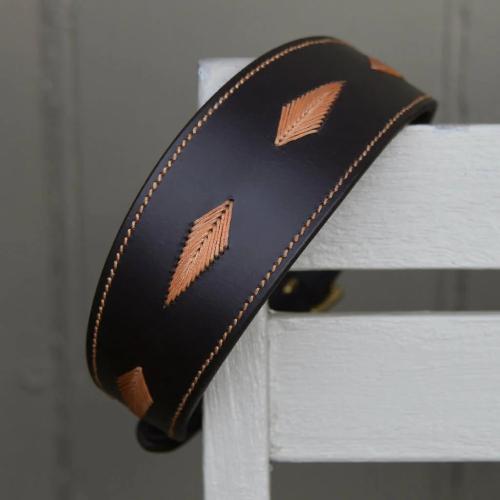Whinlatter - a beautiful hound collar with distinctive, and very stylish feather stitch detail in contrasting colours. Available in Red, with Ecru stitch, Black with Red, and Brown with Orange. In 2 sizes Small and Medium.